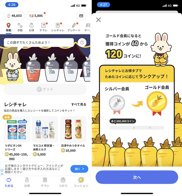 「クラシルリワード」シルバー会員に昇格! 申請していた「レシチャレ」が反映され晴れて「シルバー会員」に戻りました。 これでニンジン(移動のボトル)が10個に復活!まぁ良しと・・・。 ゴールド会員になるにはここから更に200,0000コイン分何か買わないとなりませんのでまずやりません。獲得コインが倍になるのは魅力ですが・・・。 何か欲しいもの(使えるもの)で高コインのモノでもあれば。