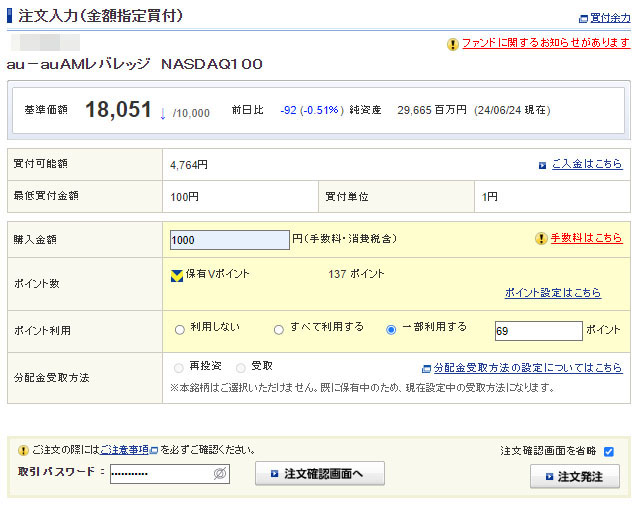 Vポイントが入ったのでauAMレバレッジNASDAQ100を1,000円分追加|2024.6.25 月末が近くなりVポイントが入る時期になりました。 今回入ったのは「三井住友カード カードご利用分 三井住友VISA(NL)」分の135ポイントです。 何時ものようにまずは「auAMレバレッジNASDAQ100」へ ポイントを約半分使い1,000円分の入金です。 69ポイント利用なので口座からは931円。もうホントに口座にお金がありません。。。 約定は27日(木曜日)の深夜です。 このところ米国ハイテクは少し調整気味でNASDAQはやや下げています。ですがこんな時に限ってリバった日に約定しそうですwww