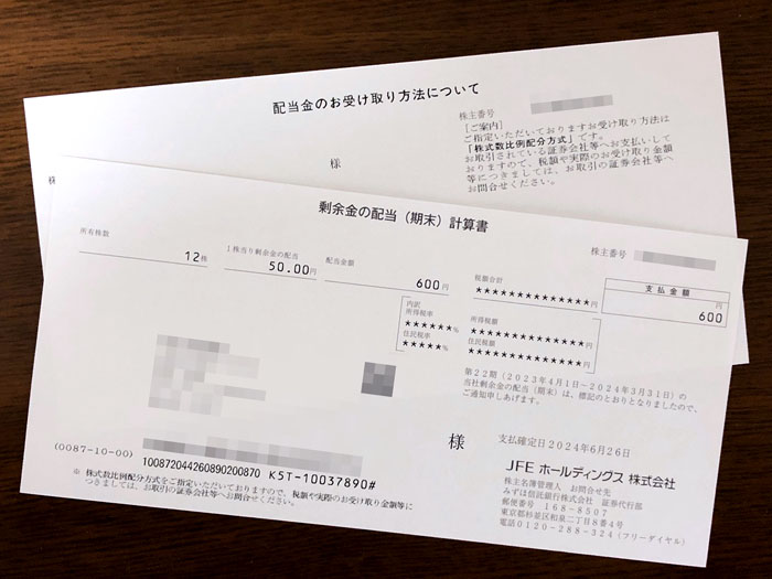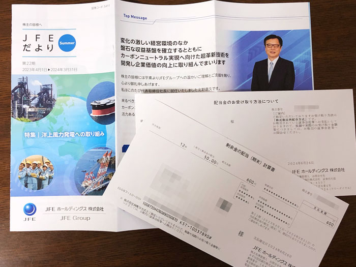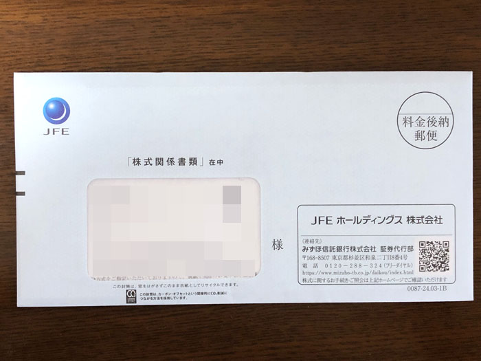JFEホールディングスから株式関係書類が届きました。