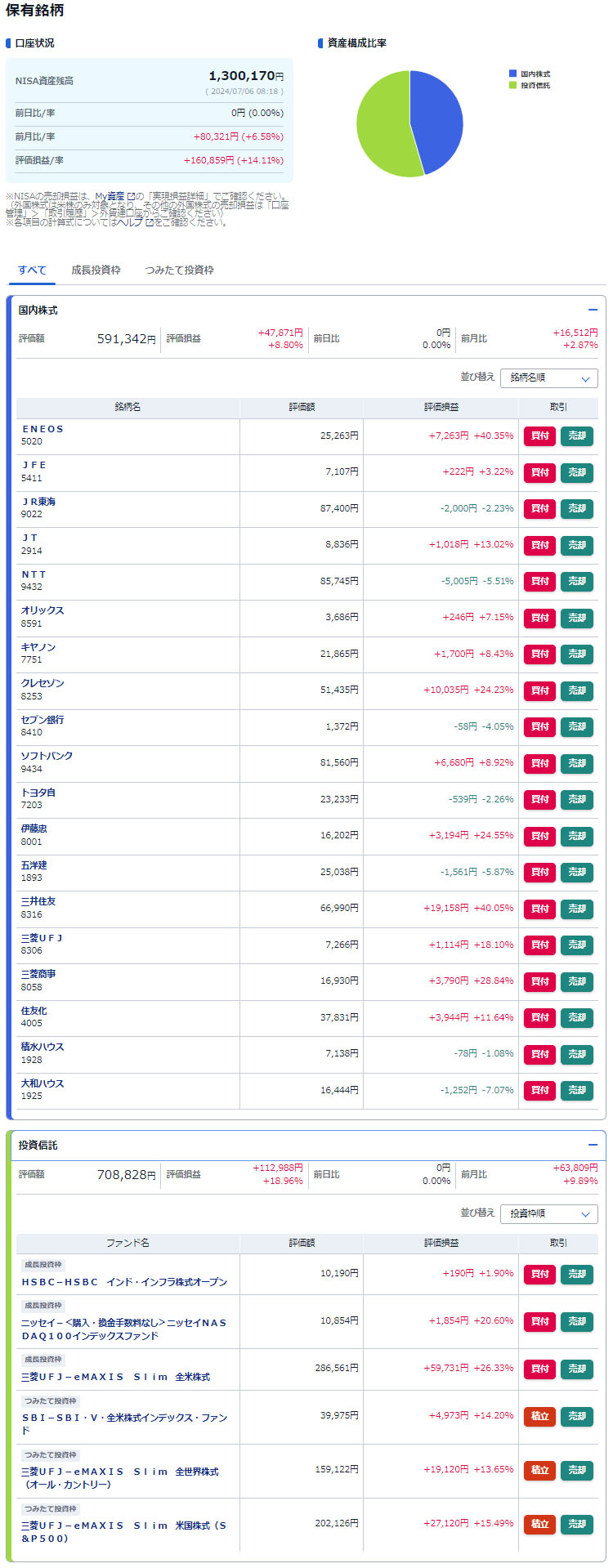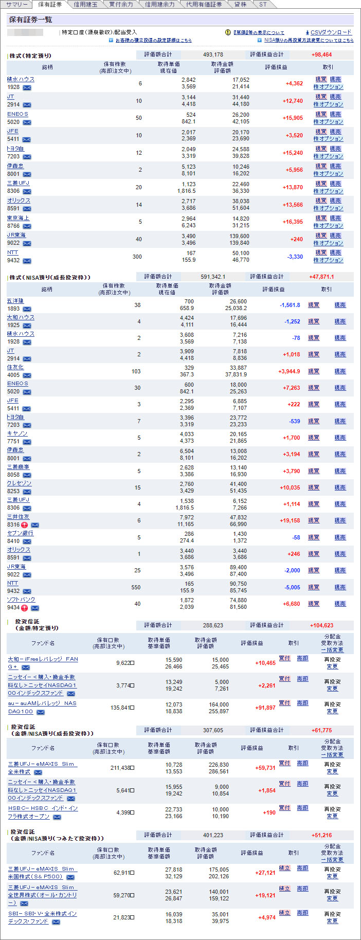 SBI証券口座も概ね順調。大和ハウス工業が少し心配ですが他の含み損は気にしていません。