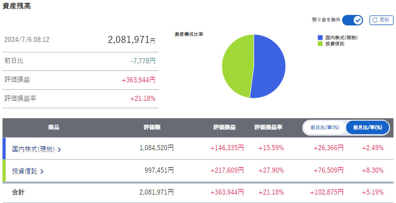 動きはないですが株高のおかげで先月から57,979円も増えました。