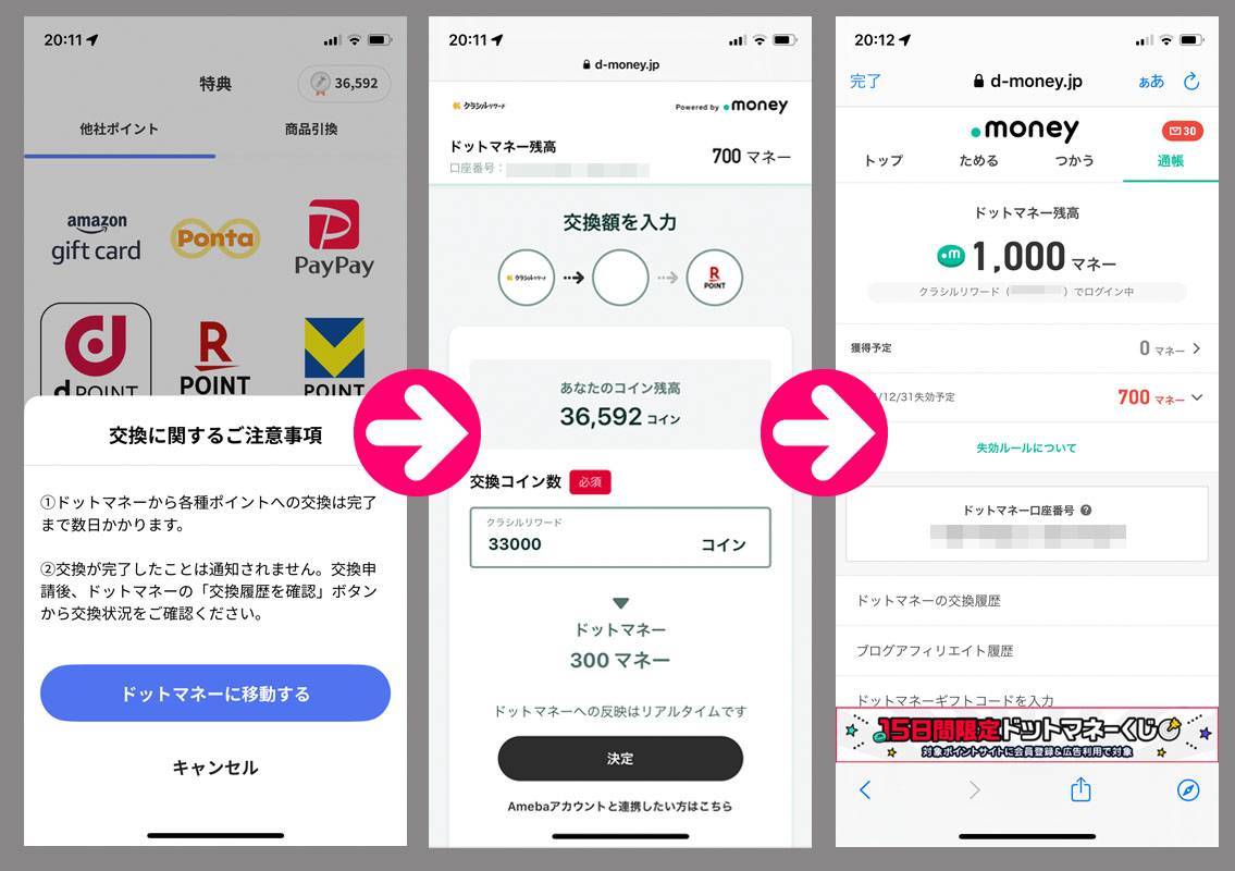 クラシルリワードのコインが貯まったのでドットマネーに変換からの換金手続き|2024.7.10 2回ほどレシチャレをしたので33,000コインに達しドットマネーに・・・そして換金の手続きをしました。 今回の300マネーで1,000マネーになり換金へ (詳しい変換方法と換金方法はこちらをご覧ください) 私の場合、クラシルリワードは楽天銀行口座に紐づけています。 1,000マネーで1,000円です。今が水曜日の夜なので金曜日に間に合うかな??? これで口座のドットマネーはなくなりましたので次回の換金までは4回分の33,000コインをまわさなければなりません。。。またレシチャレかな???