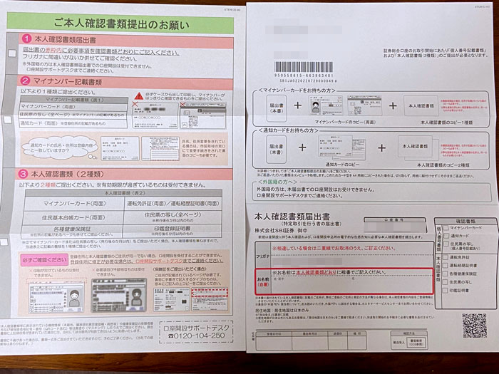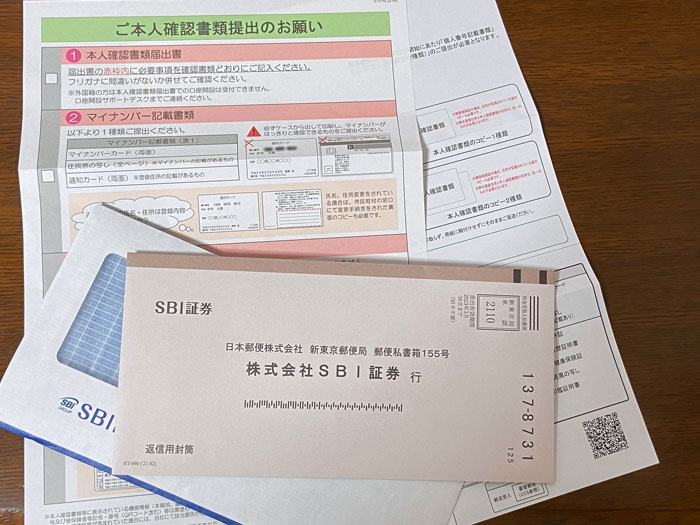 本人確認書類提出 コメントを残す SBI証券より「本人確認書類提出」の書類が普通郵便で届きました。 こちらは提出書類なので書留ではなくポストに投函されていました。 中身は説明書と提出書類です。 楽天証券と同様に マイナンバーカード+本人確認書 マイナンバー通知書の場合は本人確認書は2種が必要でした。 私はマイナンバーカードはまだなので「通知書」と「運転免許所」「健康保険所」で提出(当然ですが全てコピーです)しました。やはりオンラインで完結するのがお勧めです。