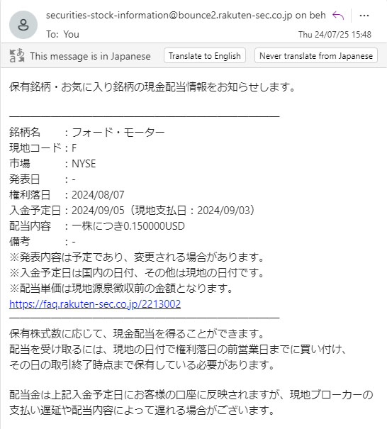 フォード・モーター(F)配当予告 2024.9 今日、2株追加したフォードの配当予定通知のメールが楽天証券から送られてきました。 決算は悪かったですが配当は据え置きの$0.15のようです。 $0.15×17株=$2.55 $2.55×0.9=$2.295 $2.295×0.8=$1.836 次回から2株増えたのでこれぐらいになると思います。