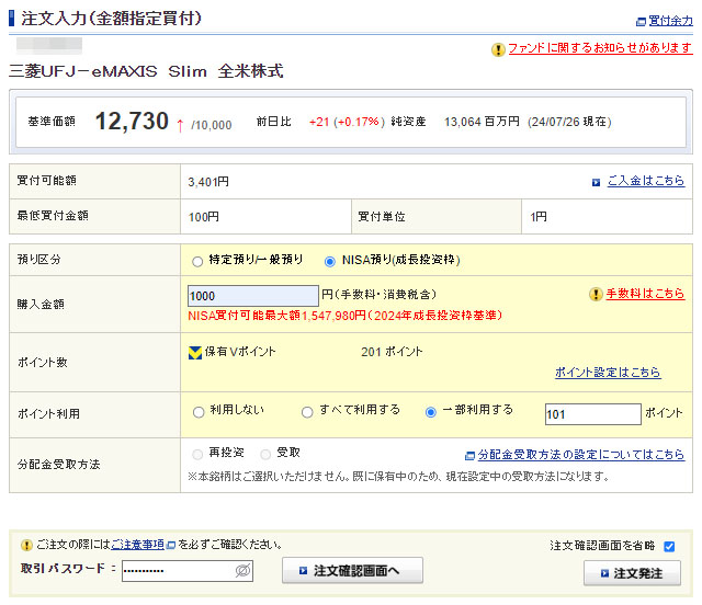 Vポイントが入ったのでeMAXIS Slim 全米株式を1,000円分追加|2024.7.28 そして毎度の「eMAXIS Slim 全米株式」にも1,000円分の入金。 こちらは何時ものようにNISA口座。ポイントはやはり約1/3となる101ポイントを利用します。 口座からは899円の持ち出し。 約定は30日(火曜日)となります。 足元では大型テックが売られていますが中小型銘柄(Russell2000)は逆買われ、米国企業約3,000社をカバーする全米は僅かですが上がってたりもします。この辺りは面白いところ。