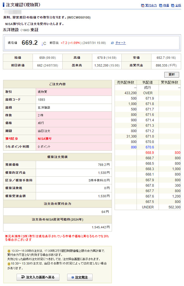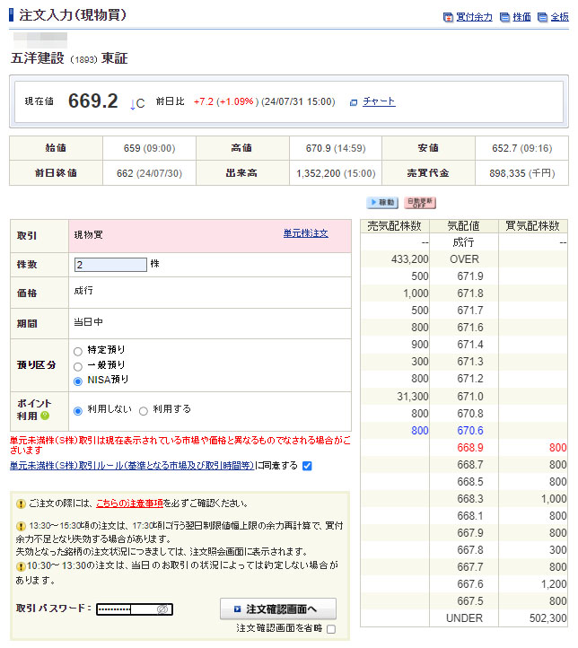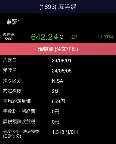 これで「五洋建設」は40株の保有となり全てNISA口座です。平均取得単価は700円を割って698円となりました。