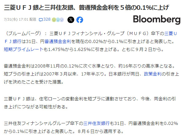 三菱UFJ銀行と三井住友銀行、普通預金の金利を0.1%に! 今日、日銀の金融政策決定会合があり短期金利の目標の上限が0.25%に引き上げられた。 間際になって日経新聞でリーク記事が朝刊に出ていましたが、大方の予想では今回は据え置きが多かったような・・・? 極端な円高になるのは問題ですが、まぁ個人的に利上げして円高になるのは歓迎なのです。住宅ローンも先月一部繰り上げ返済しました。 そして発表後の当日、大手2行の預金利息の引き上げが発表されました。 0.1%なら楽天銀行と同じです。 益々楽天とは疎遠になりそうな・・・www