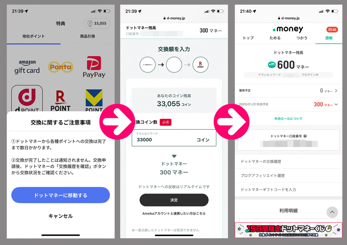 クラシルリワードのコインが貯まったのでドットマネーに変換|2024.8.1 クラシルリワードのコインが33,000になったのでドットマネーに交換します。 (詳しい変換方法と換金方法はこちらをご覧ください) これで600コインとなりました。まだ、この33,000を2回やらないと換金に至りません。。。