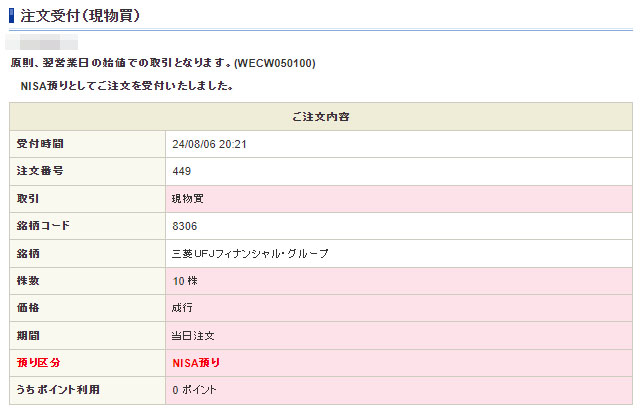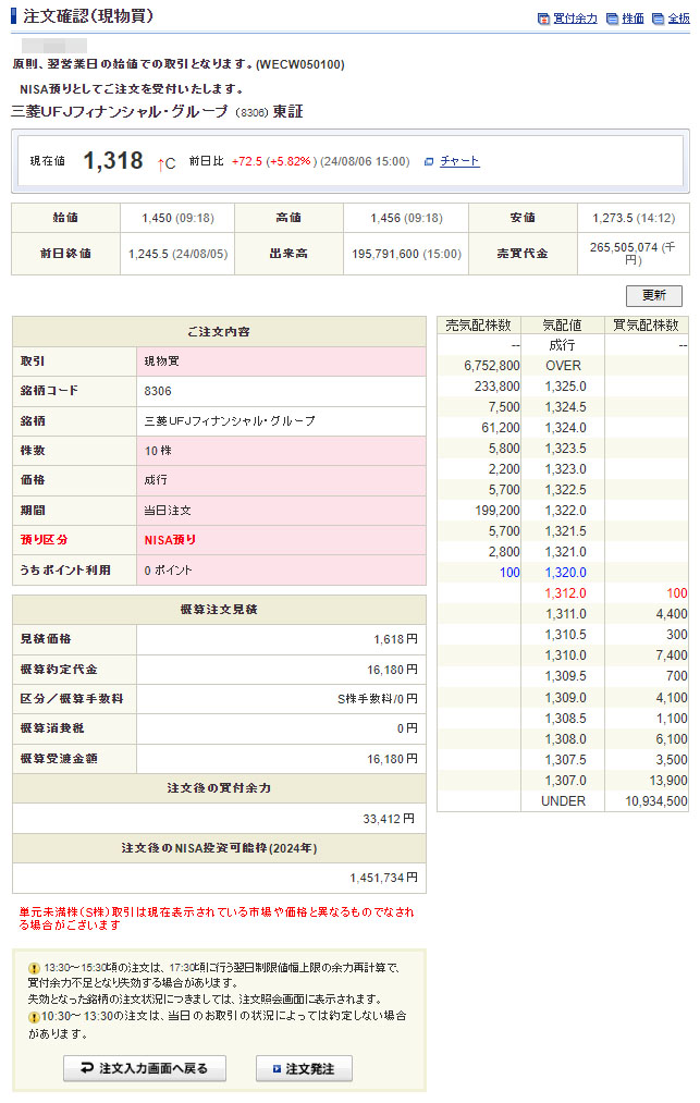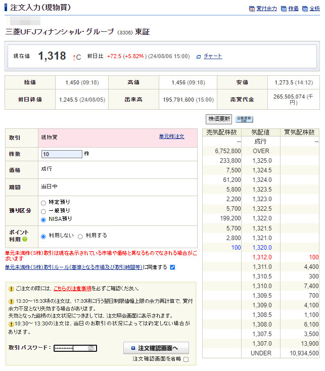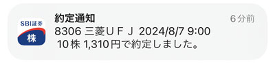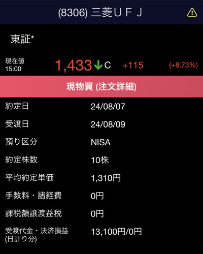 そして昨日の大幅下げから今日リバウンドした「三菱UFJフィナンシャルグループ」を思い切って10株追加します。