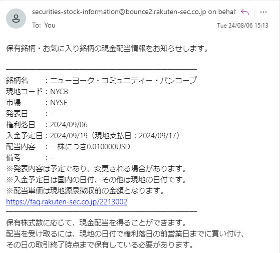 ニューヨーク・コミュニティー・バンコープ(NYCB)配当予告 2024.9
