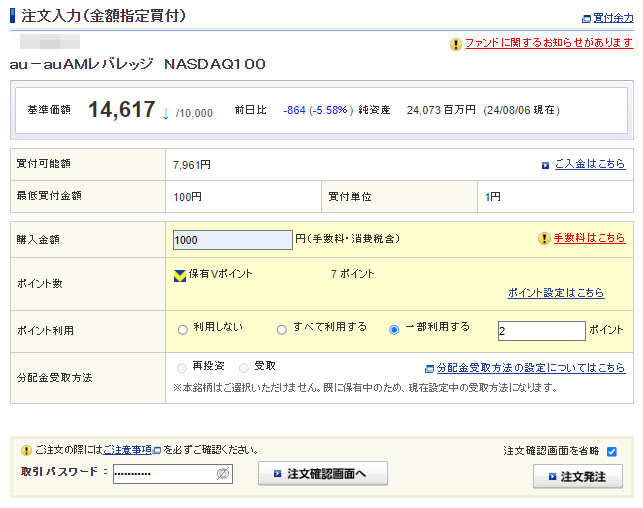 毎度ですが「auAMレバレッジNASDAQ100」へ1,000円分の追加!