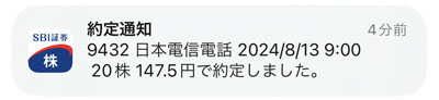 147.5円で約定しました。通知が来たのが13分でしたが9:00となっています。