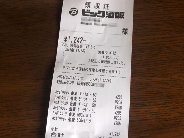 6本買って税込み1,242円でしたので242円は現金で支払いました。財布に小銭がたくさんあったので。「四季の味わい」の方が3円も安いのですがアルコール度数が1%低いので何時も「ラガー」中心になりますw