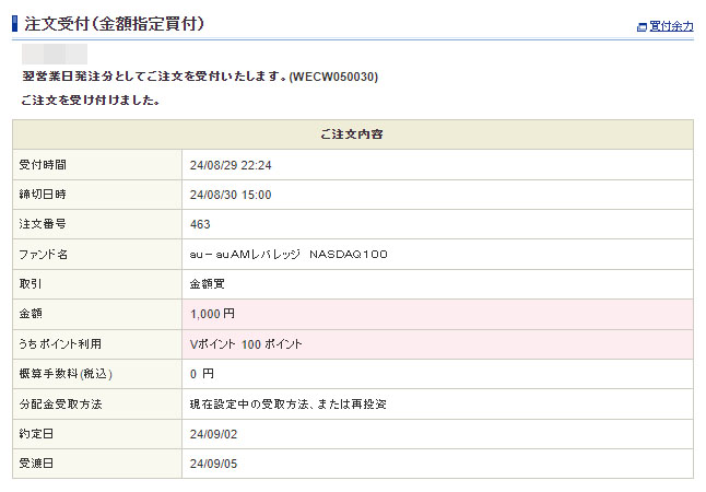 毎度ですが「auAMレバレッジNASDAQ100」に1,000円(額面)入れます。