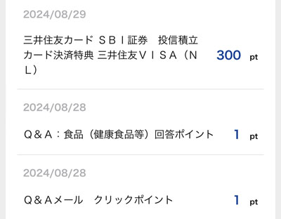 月末に何時も入る「三井住友カード SBI証券 投信積立カード決済特典 三井住友銀行VISA(NL)」分が入りました。