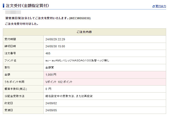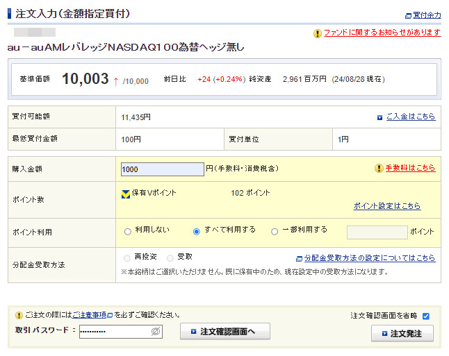 Vポイントが入ったのでauAMレバレッジNASDAQ100為替ヘッジ無しを1,000円分追加|2024.8.29 今回もまだ資金が少しあるので「auAMレバレッジNASDAQ100為替ヘッジ無し」にも1,000円分! ポイントは「すべて利用する」で102ポイント。こちらはレバなので特定口座になります。 口座からの現金は898円。 約定は週明けの月曜日です。 来月から「auレバナス」は “為替ヘッジあり” は しばらくお休みして円高傾向ですので、この “為替ヘッジなし” に2,000円づつ入れようかと画策していますwww 今のところまだ未定ですがw