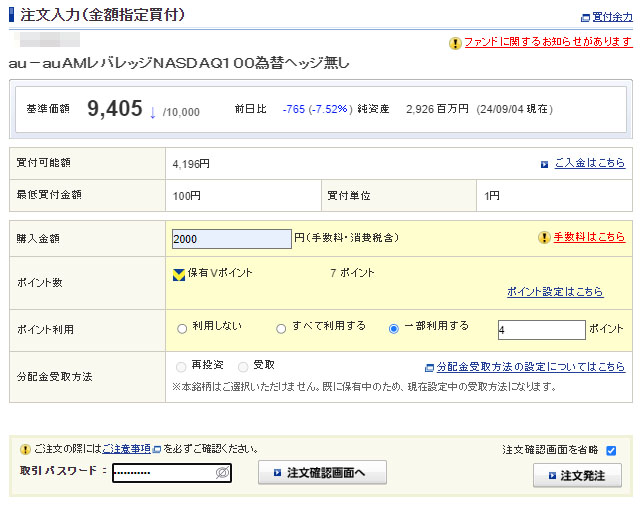 Vポイントが入ったのでauAMレバレッジNASDAQ100為替ヘッジ無しを2,000円分追加|2024.9.5
