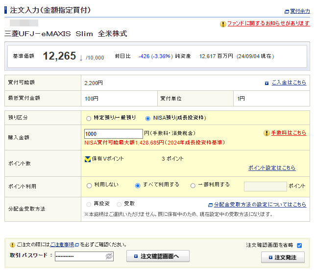 NISA口座で額面1,000円分。ポイントは残りの3ポイントを「すべて利用する」です。
