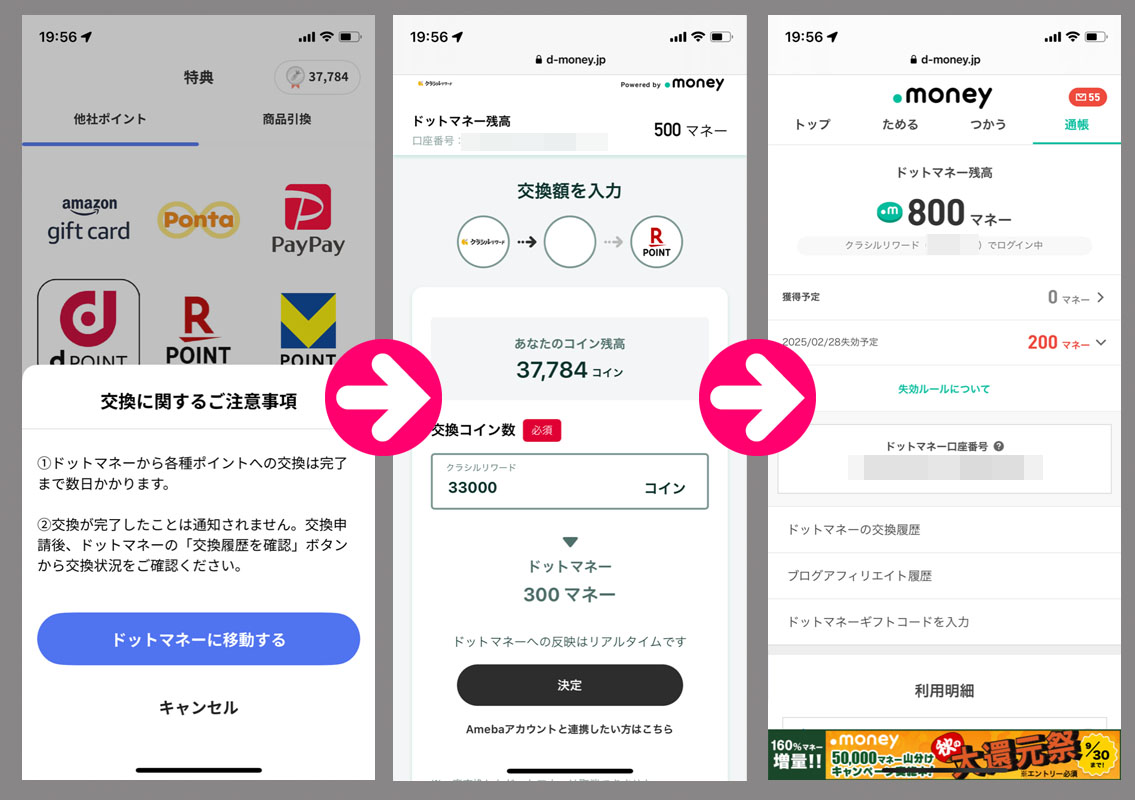 クラシルリワードのコインが貯まったのでドットマネーに変換|2024.9.7 さすが!レシチャレ効果でたった4日で33,000コインに達しました。 コインをドットマネーに替えます。(詳しい変換方法と換金方法はこちらをご覧ください) これで800ドットマネーになったのであと1回(1周)33,000コインを貯めれば換金に進めます!