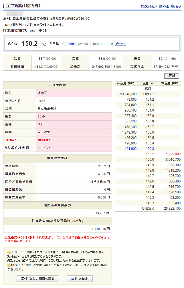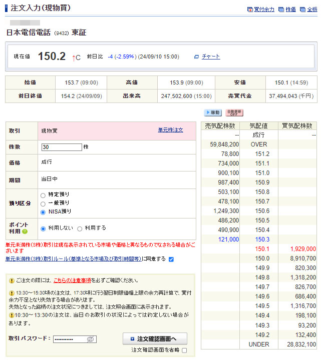 続けて日本電信電話(NTT)も30株追加で購入します。