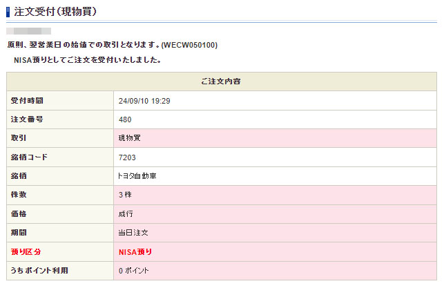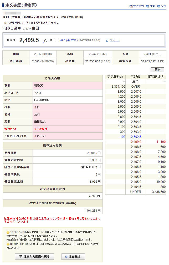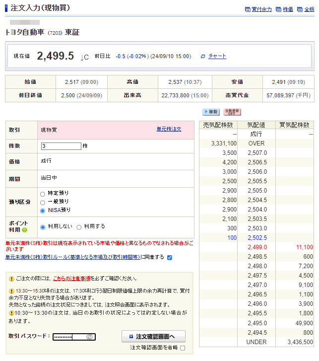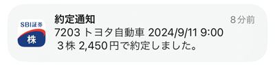最後にトヨタ自動車を3株買い注文しました。トヨタも9月が権利落ちです。