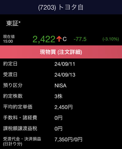 単元未満3株。NISA口座です。ホントはもう少し買いたいところですがまだ9月10日ですので・・・。
