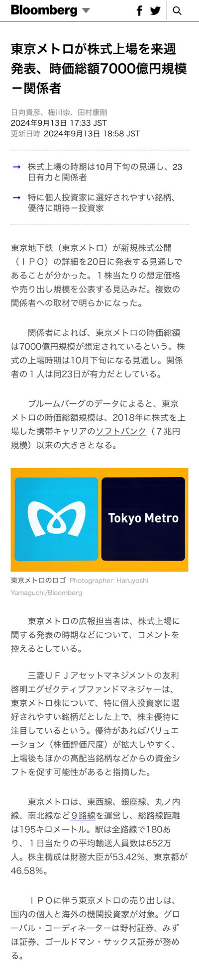 (Bloomberg 東京メトロが株式上場を来週発表、時価総額7000億円規模-関係者 より転載)