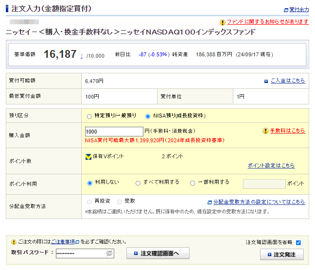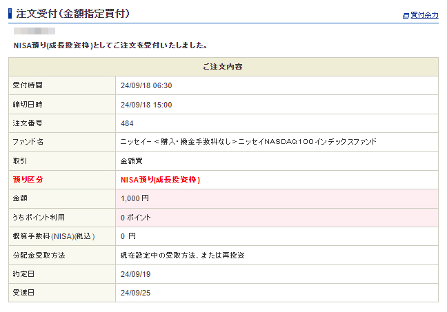 9月12日に申請していたクラシルリワード分のドットマネーがようやく現金化されましたので「ニッセイNASDAQ100インデックスファンド」へ追加します。