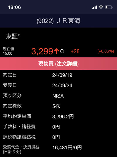 これでJR東海はNISAで42株の保有で平均取得単価は3,505円とまだバリバリの含み損です。