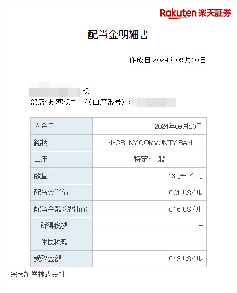 ニューヨーク・コミュニティー・バンコープ(NYCB)から配当が入りました|2024.9.20 ニューヨーク・コミュニティー・バンコープ(NYCB)から配当が入りました・・・ 配当は$0.01・・・1セントです。 しかも併合後の基準で。。。 ですので16株保有で・・・ $0.01×16=$0.16 $0.16×0.9=$0.144 $0.144×0.8≒0.1152 で実際に入ったのは$0.13 ドル円143円で計算すると18.59円。。。何も言う事はない