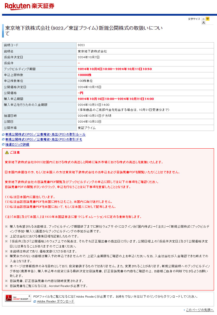 東京メトロ【東京地下鉄株式会社】IPOブックビルディング申し込みページ|楽天証券 楽天証券からの【IPOニュース】メールにありました。 https://www.rakuten-sec.co.jp/web/domestic/ipo/90230.html