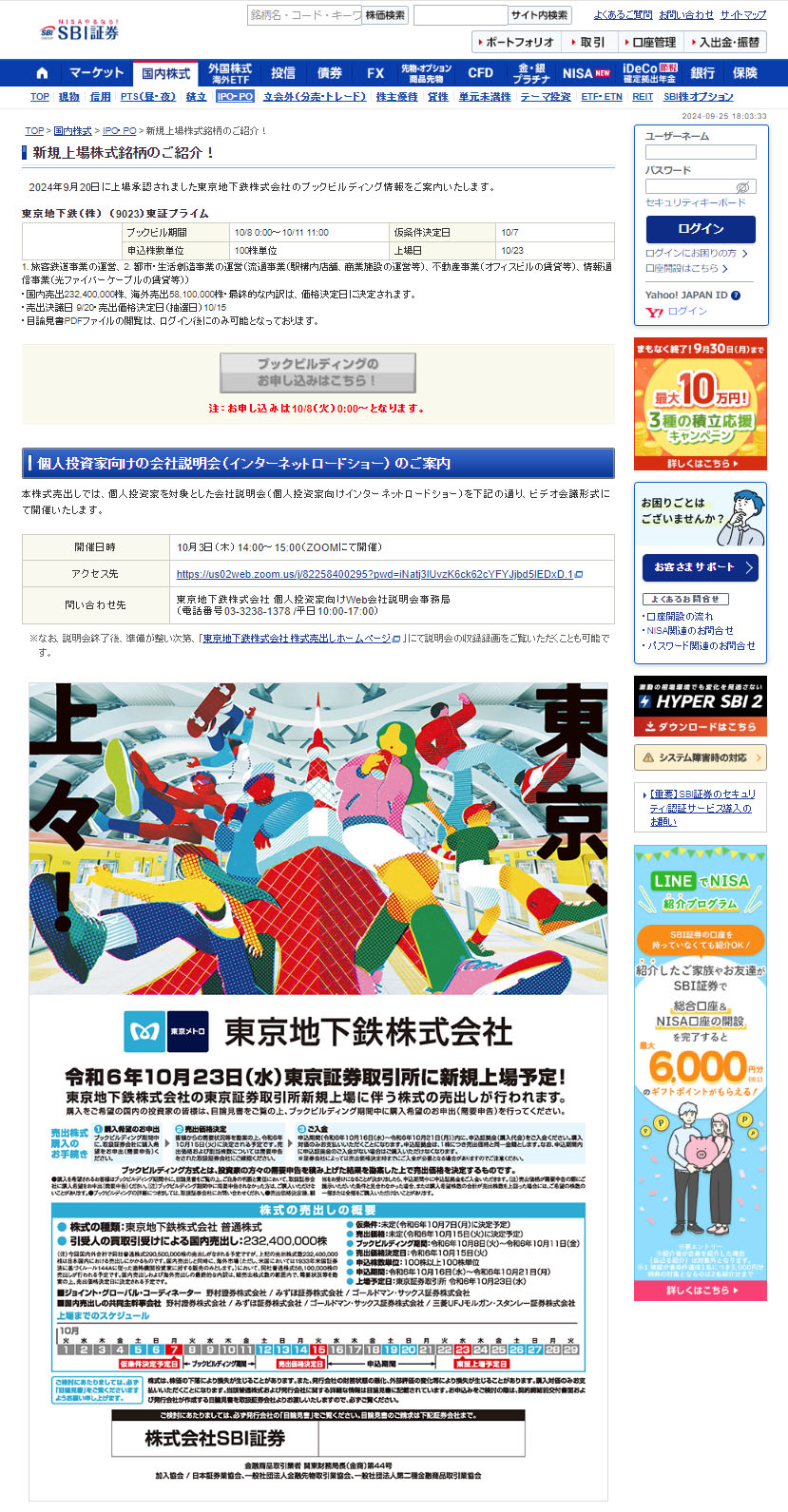 東京メトロ【東京地下鉄株式会社】IPOブックビルディング申し込みページ|SBI証券 SBI証券にもページがありました。 私は両証券会社にブックビルディング申し込みます。 SBI証券が当選したらNISA口座で。 SBIが外れ楽天が当選したら・・・仕方ないので特定で。 両方外れたらそれまでですが、両方当選したら・・・考え中ですwww