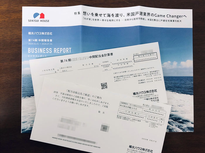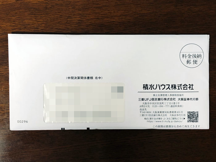 昨日、配当が出た「積水ハウス」から中間決算関係書類が届きました。