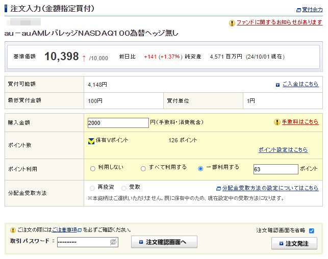 まぁイイけどw 今回も「auAMレバレッジNASDAQ100為替ヘッジ無し」に2,000円分です。