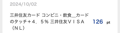 9月は入らなかった「三井住友カード コンビニ・飲食_カードのタッチ+4.5% 三井住友VISA(NL)」分、126ポイントが入りました。これって9月分?入るタイミングが分らない。。。