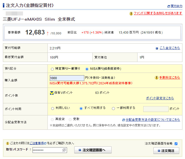 Vポイントが入ったのでeMAXIS Slim 全米株式を1,000円分追加|2024.10.2