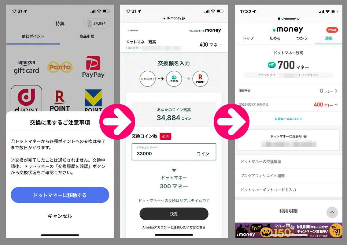 クラシルリワードのコインが貯まったのでドットマネーに変換|2024.10.7 幾つかのレシチャレの応募がコイン化され33,000に達したのでドットマネーに交換します。 (詳しい変換方法と換金方法はこちらをご覧ください) これで2周目。あと1回33,000貯めれば換金です!