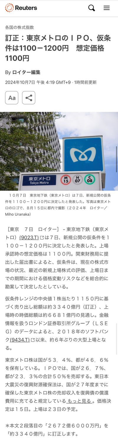 (Reuters 訂正:東京メトロのIPO、仮条件は1100-1200円 想定価格1100円 より転載)