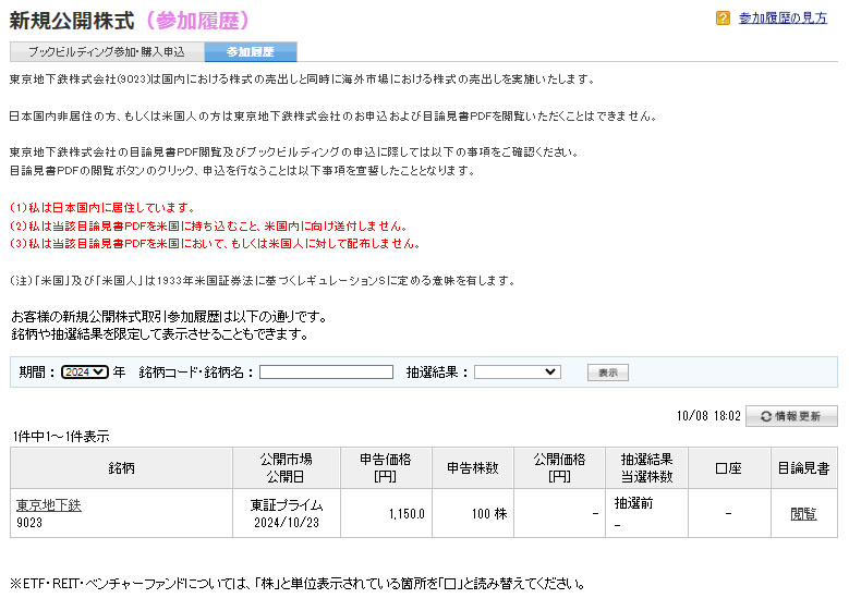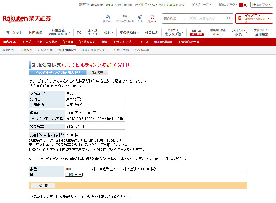 続いては楽天証券でも東京メトロIPOのブックビルディングの参加に応募。