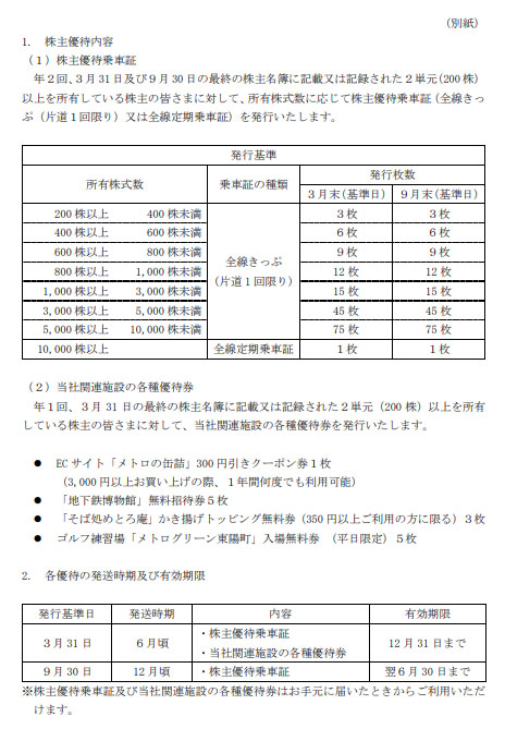 東京メトロ【東京地下鉄株式会社】IPO|おまけ情報(株主優待) 10月23日に上場する「東京メトロ」 すでに株主優待の内容が明らかになっていますので転載しておきます 他の鉄道会社に比べ株価が安いためか?200株以上の保有が無いと優待は受けられないようです。 ん~~~やはりどうせなら200株欲しいな~ 乗車券に加え「メトロの缶詰」とか「そば処めとろ庵のかき揚げトッピング」とかも面白そうwww 追記 「メトロの缶詰」ってECサイトの愛称?なんですねw てっきり「鯖缶」か何かかと・・・笑