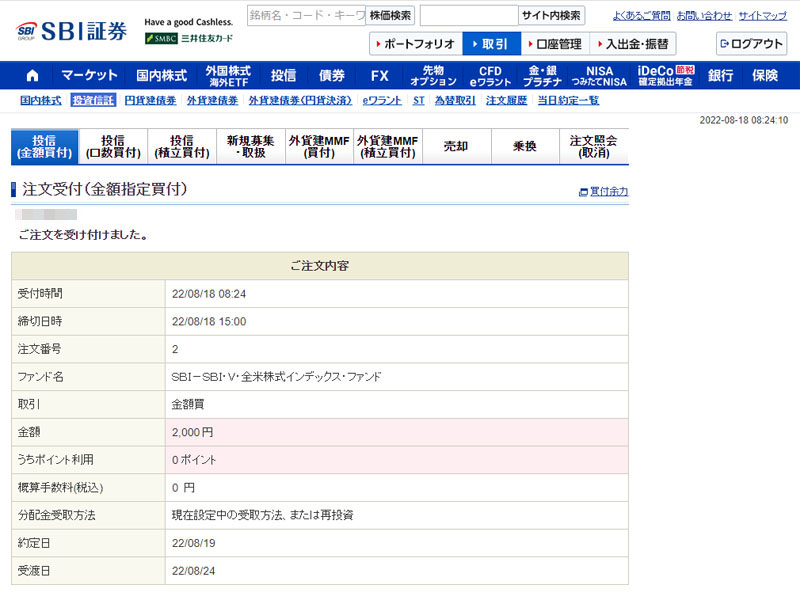 SBI証券も勝手が解ってきたので「SBI・V・全米株式インデックスファンド」に2,000円だけ「金額指定買付」で買付