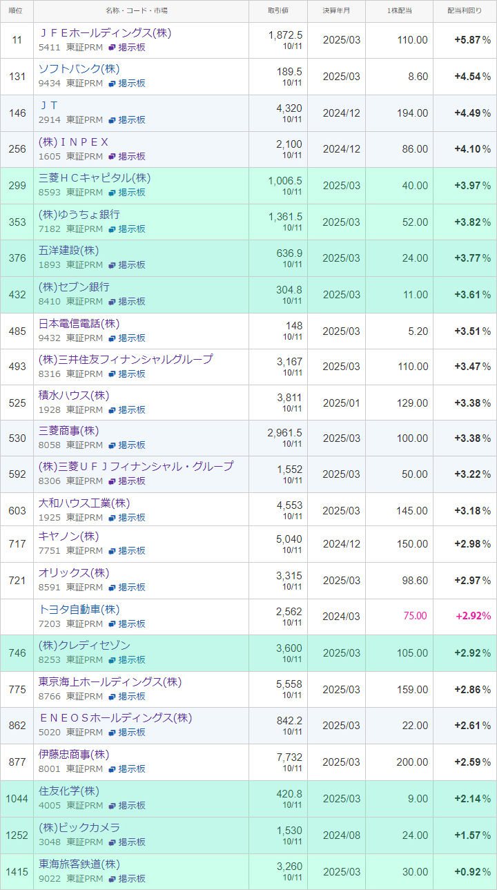 こうしてみると株価が高騰して利回りが下がり現在保留中の「ENEOS」より伊藤忠商事の方が更に利回り悪いw でも伊藤忠は確か累進配当だったような・・・?(違うかも)