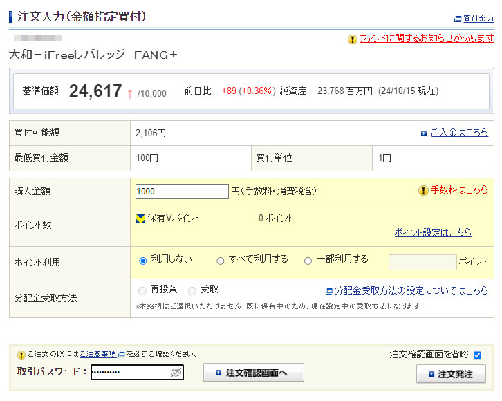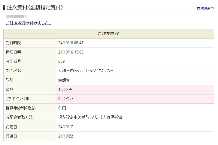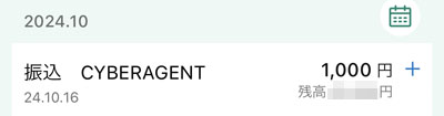 歩いて稼いだ資金を「iFreeレバレッジFANG+」へ|2024.10.16 同じく換金手続きをしていた「トリマ」分も 三井住友銀行口座にCYBERAGENTからの入金がありました。 トリマは「iFreeレバレッジFANG+」へ。そのまま1,000円分の入金です。 このところまた「iFreeレバレッジFANG+」も調子良くなり上昇気配です。 こちらはレバなので特定口座。 やはり約定は明日の10月17日です。 昨晩下がっているので基準価格がそれならイイのですが・・・。よく分かっていません。