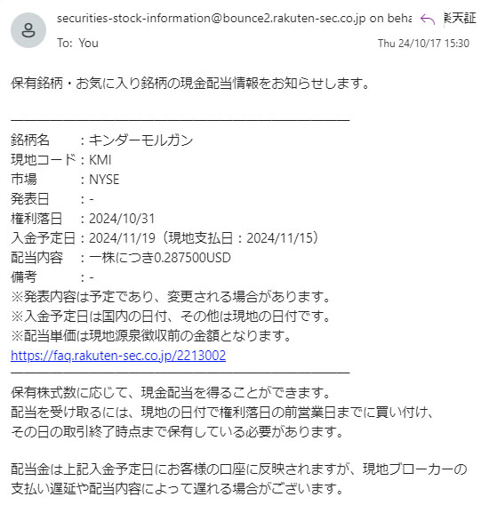 キンダー・モルガン(KMI)配当予告 2024.11 楽天証券から米国の高配当銘柄「キンダー・モルガン(KMI)」の11月配当のお知らせメールが着ました。 キンダー・モルガンは20株の保有で配当も前回、前々回と変わらずなので $0.2875×20株=$5.75 $5.75×0.9=$5.175 $5.175×0.8=$4.14・・・で、前回は$4.13でした。 KMIは買い集めていたころより株価が上がってしまいなかなか買い増し出来ません。 $17ぐらいだった時には合間に買えたんですけどね~