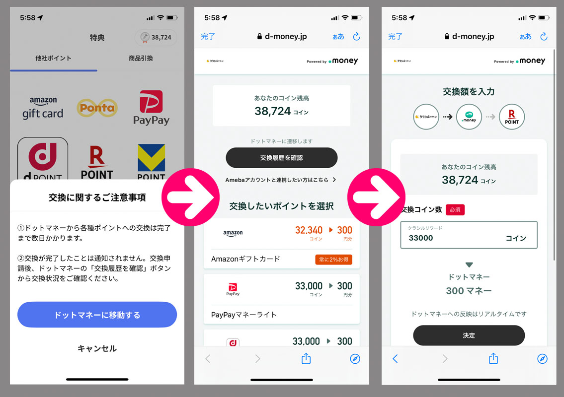 クラシルリワードのコインが貯まったのでドットマネーに変換|2024.10.20 先日のレシチャレ分「金麦サワー」2件が承認されコインが33,000になったのでドットマネーに交換します。 (詳しい変換方法と換金方法はこちらをご覧ください) 1周目で300マネーです。 換金には1,000マネーが必要なのでコレをあと3周です。