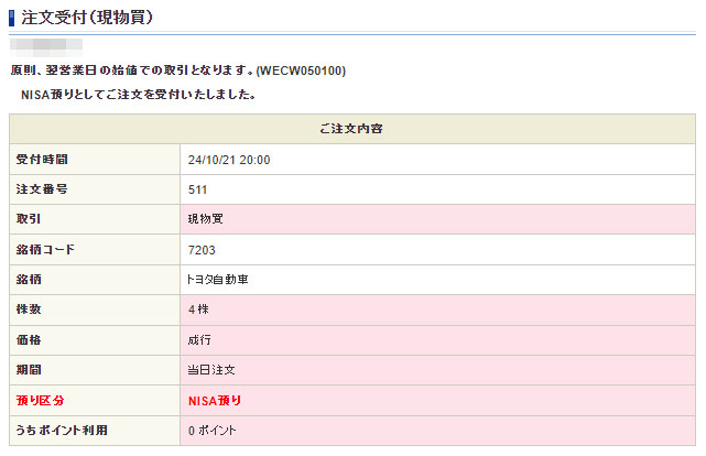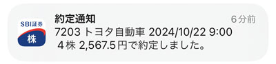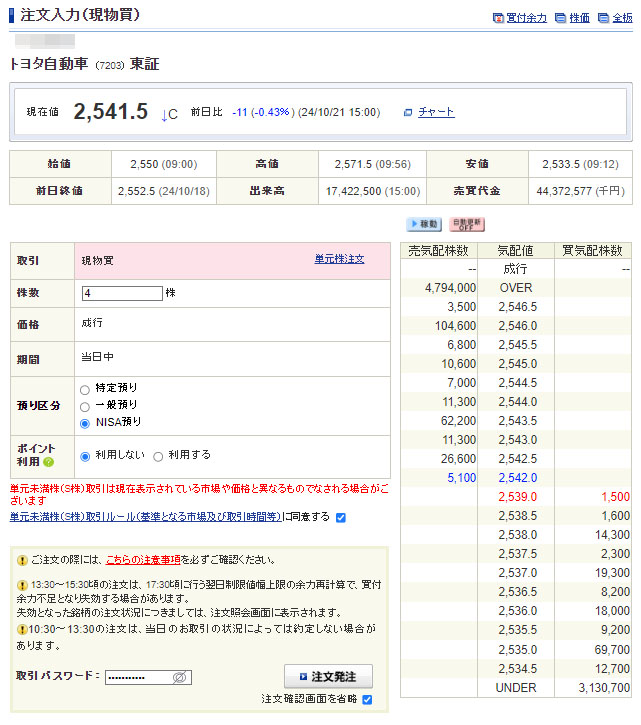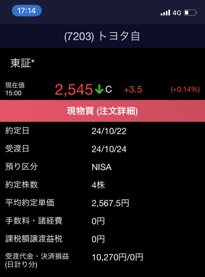 まずは目下、含み損ナンバーワン銘柄の「トヨタ自動車」を4株。これでNISA口座で18株、特定口座で12株の保有で合計30株になります。NISA口座での平均取得単価も3,000円を割り込む予定(ほぼ確実)。