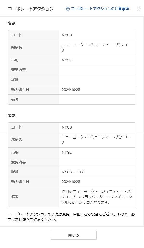 楽天証券のNYCB(FLG)のページにもコーポレートアクションがありました。