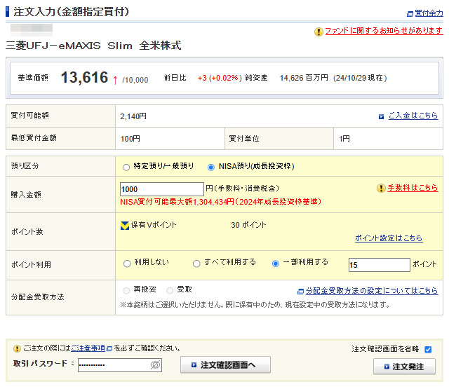 こちらは毎度のNISA口座です。ポイントは15ポイント利用なので口座からは985円の持ち出しです。