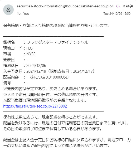 フラッグスター・ファイナンシャル(FLG)配当予告 2024.12 先日決算があり社名とティッカーが変わった「フラッグスター・ファイナンシャル」の配当情報のメールが楽天証券から届きました。ファイナンシャル?フィナンシャル?? 社名は変わっても配当は変わらず。。。 16株保有ですので $0.01×16=$0.16 $0.16×0.9=$0.144 $0.144×0.8≒0.1152 で前回は$0.13でした。 約20円。。。買い増す気もしませんwww