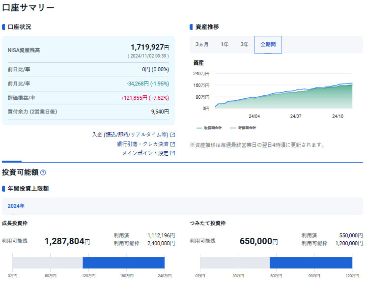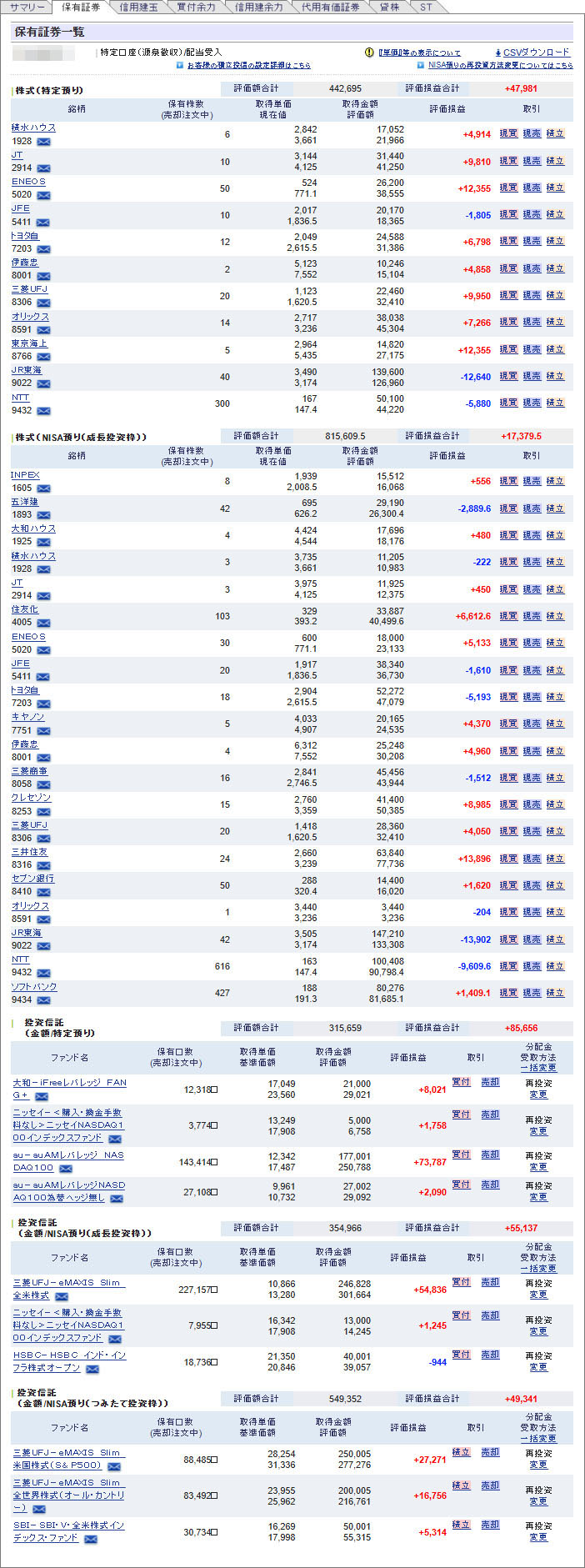 SBI証券のNISA口座も前月比でマイナス。しばらくは調整局面かな?選挙結果如何では大きな下げもあるかも?私も珍しく現金余力を少しですが残しています。